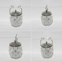 Seau à biscuits ancien en cristal de Baccarat, modèle pierreries diamants, monture en métal argenté, hauteur totale (poignée levée) 22,5cm environ, diamètre du corps au plus fort 13,5cm environ, diamètre de la base 10cm environ, objet d’occasion usuel ancien, une minuscule égrenure (voir la flèche noire sur une des photos), traces et usures d’usage, état correct, sans fêle ni restauration.