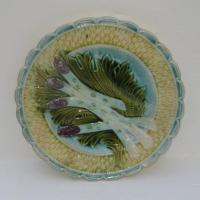 Ancienne assiette en barbotine pour asperges ou artichauts, marli décor vannerie