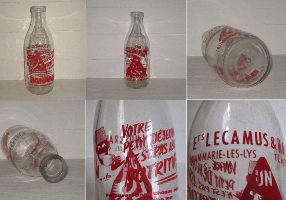 Jolie bouteille de lait publicitaire ancienne en verre, des années 60 environ, hauteur 26,5cm, diamètre de la base 8cm, écriture rouge sur le corps, d’un côté "Ets LECAMUS & RAVAUX", "Dammarie-les-Lys (S-&-M)", "Tél 937.16.61" + "dessin d'un triangle avec jeu de mot et/ou rébus (un lait de qualité)" + "Lait pasteurisé conditionné" et de l’autre côté "Y’a bon", "Votre petit déjeuner n'est pas assez nutritif !", "Préparez donc chaque matin avec ce bon lait une tasse de Banania" "le petit déjeuner de toute la famille" , dessous elle porte la marque "VB" ".1L" "L.4", traces et usures d'usage, quelques petites rayures, pas d’éclat, pas de fêle, pas de restauration.