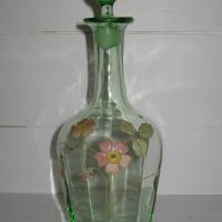 Elle est en verre vert légèrement facetté, décorée de fleurs émaillées