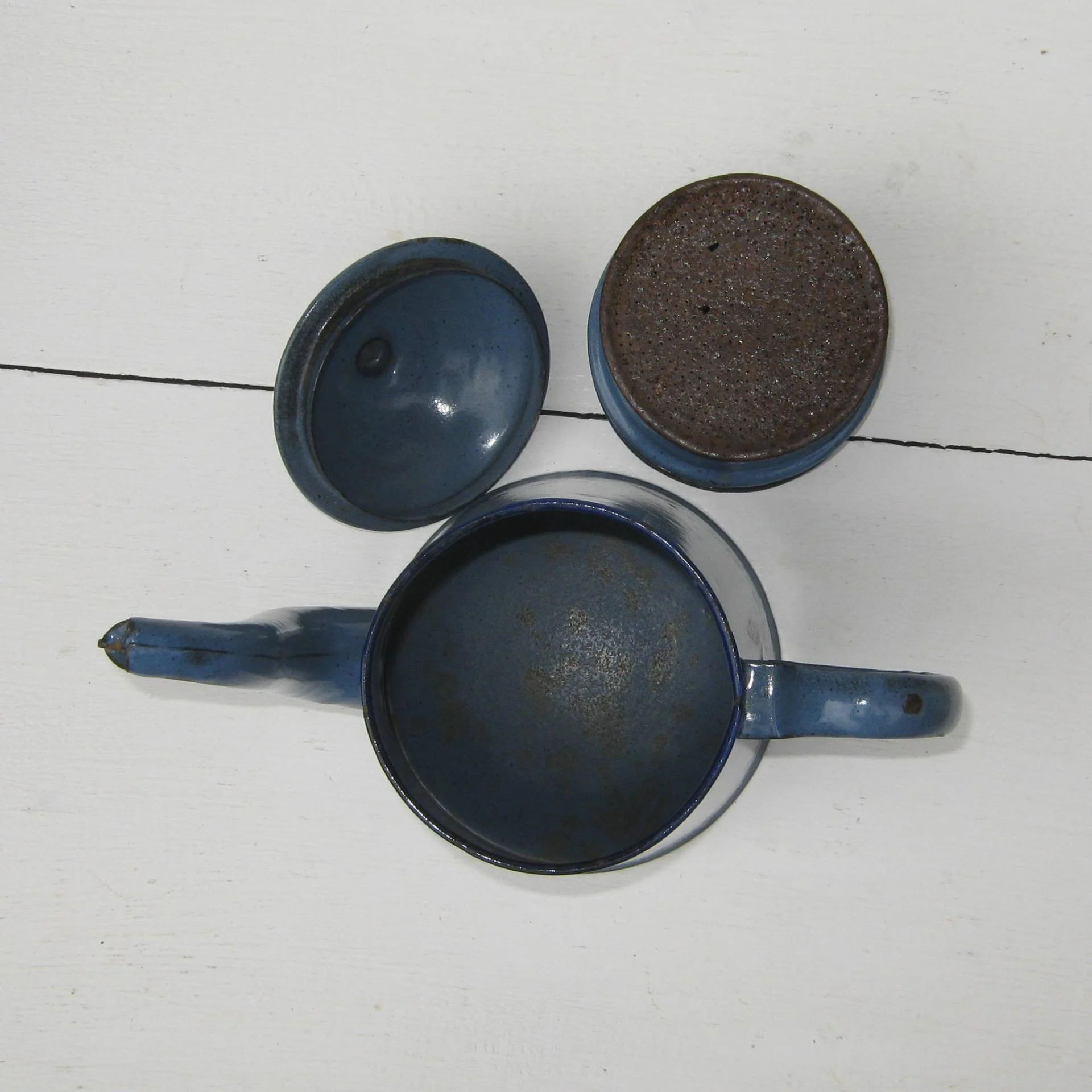 Objet d’occasion usuel ancien, traces et usures d’usage, oxydations, sauts d’émail, deux petits trous sur le filtre, quelques coups sur le corps, sans gravité, jolie déco cuisine.