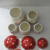 Ancienne série de pots à épices en céramique représentant des champignons amanites tue-mouches N°2 (5 pots)