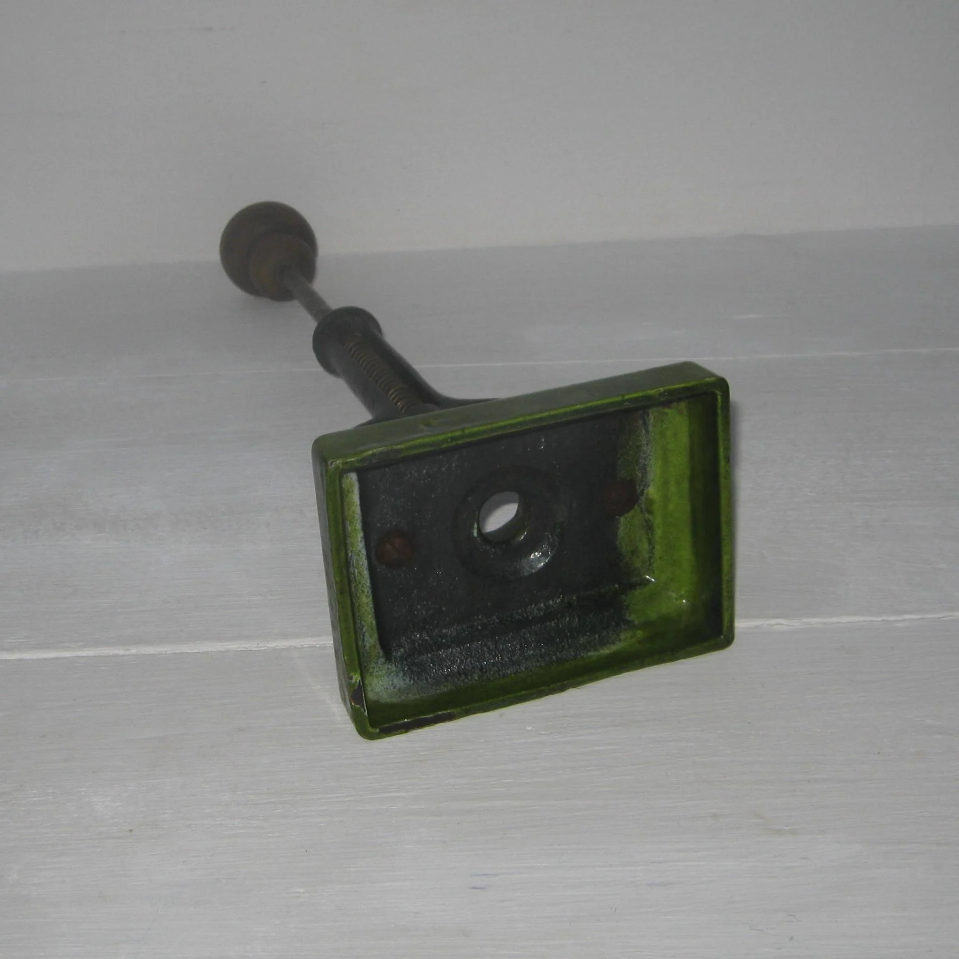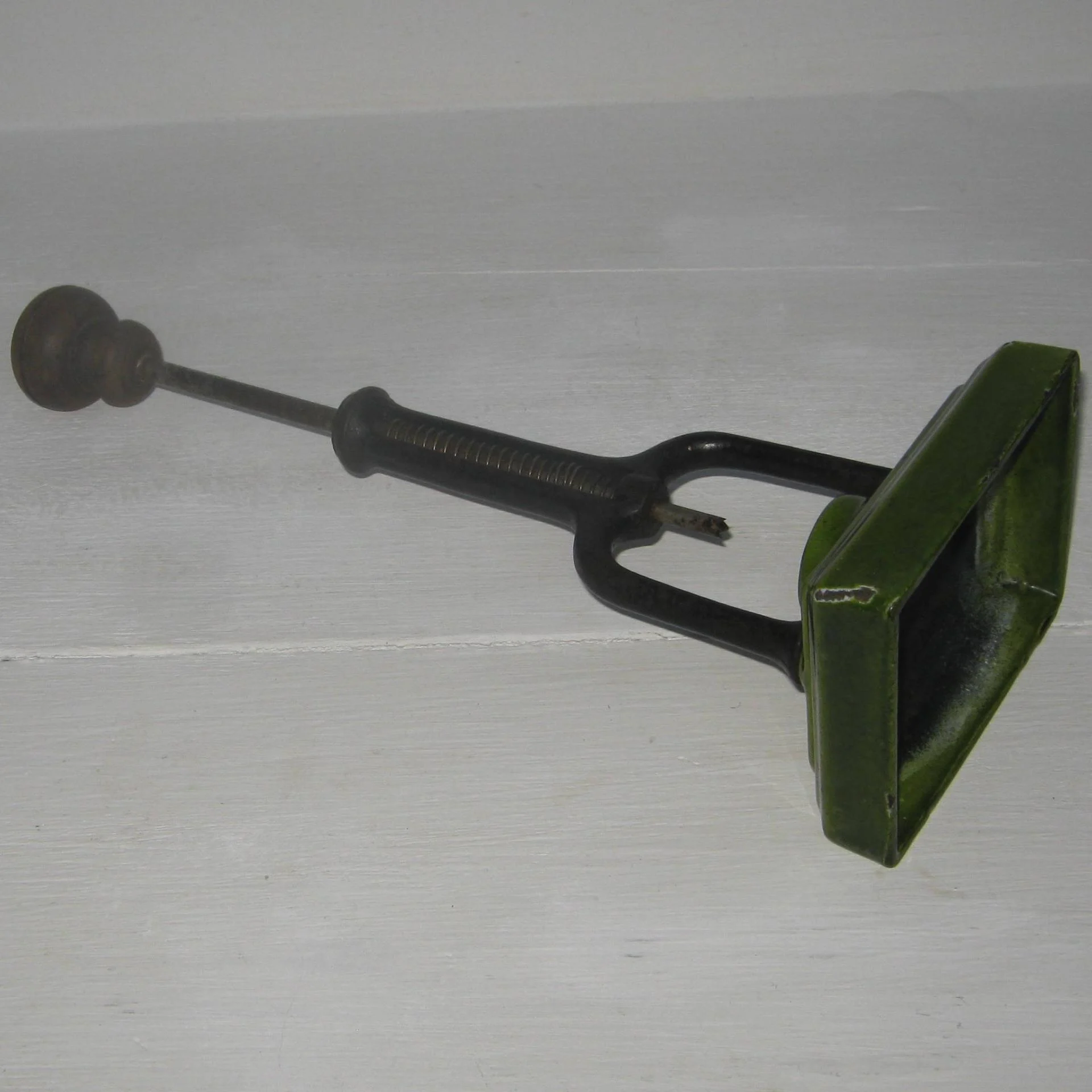 Ancien dénoyauteur pour cerises, prunes et olives, base en fonte émaillé avec cuvette pour accueillir le fruit, muni d’un poussoir à ressort qui permet d'extraire rapidement le noyau